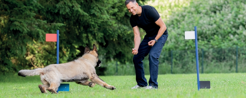 Der Parcours wird durch Geräte, den Tunnel und Hürden erweitert. Das Tempo und der Parcours werden individuell an das Mensch-Hund-Team angepasst. Sie und Ihr Hund werden noch feinfühliger trainiert. Peu à peu wird auch die Distanz von der Führzone zu den Stangen und Sportgeräten vergrößert