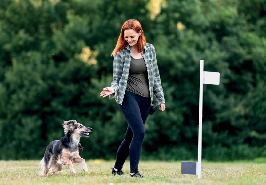 Beim Curving wird der Hund auf Distanz durch einen Parcours geführt, dadurch wird er sowohl körperlich als auch geistig gefordert.